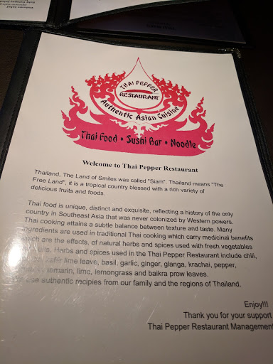 This place is a favorite of mine to go eat! It doesnt matter if I am by myself, on a date my boyfriend, or getting together with friends, this restaurant is perfect for all occasions of dinner (or lunch). I always enjoy the pleasant dining atmosphere, they make it very tranquil. And the food! <333 My boyfriend is an extremely picky eater but he adores this place... no complaints from him at all. My mother also picks Thai Pepper periodically when she is on a date, which is rare for her to stick to one place. Everything I have ordered from here has been fantastic, and relatively a lot less pricey than other places would charge. I get crazy cravings for their sushi rolls quite often (I recommend the Orange Avenue Roll sometime) and love their soups (the wonton and miso that I have tried). My boyfriend usually gets a battered chicken dish with fried rice... cant remember what its called right now. But its tasty as all get-out. Anyway, I am glad I finally remembered to review Thai Pepper. : ] I hope your experience will be just as wonderful.