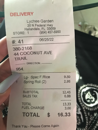 Amazing. Tonight was our first experience with this restaurant. The food was perfect. We order small orders which was perfect for two people. I dont know what We enjoy more: the house special fry rice, the moo goo gai pan, beef with mushrooms, boneless ribs or springs rolls. The delivery was fast , friendly and the food was still hot when it arrived. My husband and I are always looking for a good Chinese restaurant and we know we found it now. Thank you Lychee garden for a good dinner