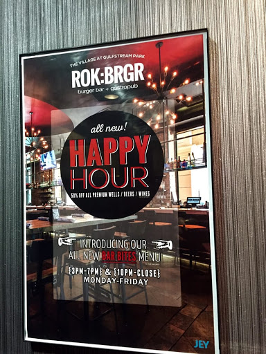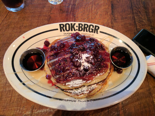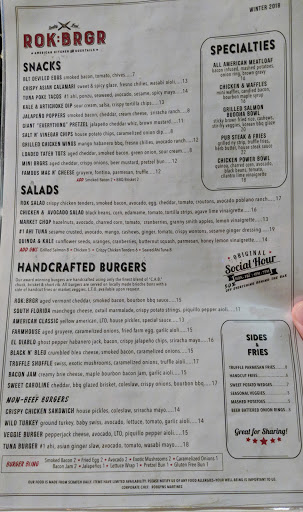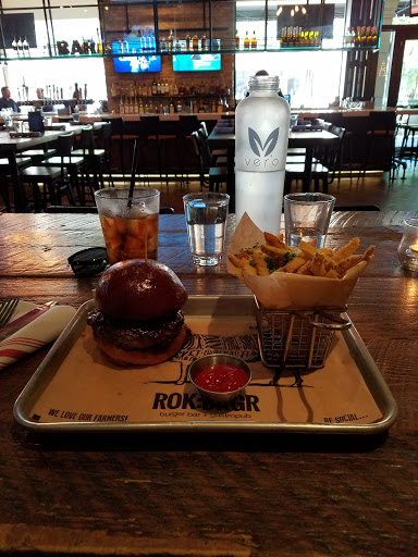 What a bummer! I was super excited to try the grub and enjoy the atmosphere at Rok:Brgr and wed planned a business get-together here for dinner. The food sounded delectable and it seemed that this would be a fun trendy place to get something a bit different. The menu offerings are interesting and unique and they advertise the many awards their burgers have won - certainly this should be a sure shot! We ordered the calamari, spinach dip and poutine (anywhere that has poutine gets an automatic 1-star increase on Yelp). The poutine wasnt Canadian-grade delicious but it was still pretty tasty. The calamari was the star of the appetizers by far! Everyone at our table ordered something a bit different from the burger menu and I think we all ended up a bit disappointed. My selection was the Sweet Caroline, a burger filled with aged cheddar, BBQ short-rib, creamy coleslaw, fried onions and Bourbon BBQ sauce. Certainly that description scream mouth-wateringly delicious, right!? Kinda wrong. It was fairly flavorless and boring. If this was an award winner at some contest, I have doubts about the quality of the other selections. All of the food was edible and not gross by any means but really was just kind of blah. What really made the trip here a drag was our waitress. She was a complete itch with a capital B. She was blatantly rude and even grabbed one of my colleagues hands when she was annoyed that he was lightly drumming to the music with his finger on the table. Perhaps she thought she was funny but it certainly wasnt perceived that way by anyone in my party. After the dinner was over and we were parting ways, I asked to speak to the manager and was a bit disappointed by his lack of concern over my complaints about our waitress. He apologized but it didnt feel like he really cared. Im not sure how they continue to attract business if this is the way they treat customers, especially a large group of well-behaved business customers that fielded a fairly hefty check. We probably wont be back when we visit the area.
