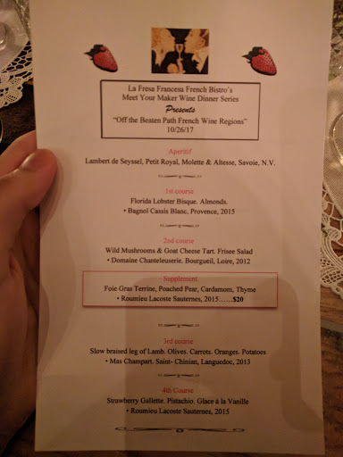 As if entering a movie set right on cue, La Vie en Rose played through the speakers above as I entered the restaurant. I quickly adjusted my eyes to the dimmed lights and noticed the vintage Christmas decor. It was Christmas night, after all. Sandy, one of the owners, cheerfully greeted me right away and showed us to our table. I dont know why, but I felt at home immediately. Ive been back three times since then. Theres a certain captivating je ne sais quoi about La Fresa. I still notice small details with each visit: the authentic Hialeah Race Track pitcher, the various framed art throughout the space, the rustic and mismatched finish of the table tops, the little Parisian stirrer for the coffees...all charming, all unique. In true Hialeah-meets-Paris form, the buttery Foie Gras I ordered as my first dish to try was served atop a toasted slice of guava bread and hazelnuts: sweet and salty with an added crunch. The second time, guava granita topped the foie. The sugary slush somehow didnt take away from the foies stardom, as Id initially anticipated. Given the quaint kitchen and staff size, orders can sometimes take a while. I usually order from the Olive Bar menu (nicoices, picholines, castelvatrano, and also the boquerones) while I wait for the appetizers to arrive. I also prefer to put my entire order in and let them course it out. Its best to visit on a day when you arent rushed. Come ready to have a leisurely dinner, enjoy some wine, and savor every bite while listening to French classics. The wait is worth it! Ive become attached to some of the dishes. The Egg Cocotte (parsley, gruyere, truffle, soft baked egg), for example, can be filed under "comfort food." The soft egg combined with the freshly baked bread (usually from ZTB) makes a perfect starter: close-your-eyes worthy every time. I certainly cant choose a favorite between the Braised Australian Lamb Shank (accompanied by Le Puy lentils) and the Braised Oxtail. Its like choosing a favorite child! Not happening. The Hanger Steak (topped with a 25 year aged balsamic and accompanied with a crisp, delicately-seasoned green salad) is so simple, yet prepared with an obvious edited hand. For dessert, one word: crepes. If you follow my blog, you wont be surprised to learn I often order the Guava Crepe. I was, however, shocked to be even more blown away by the Butter Crepe. Its so easy to mask the flavor of a subpar crepe with a toppings overkill. Here, the butter is just an added touch: a delightful highlight. This flavorsome thin crepe stands on its own with just the right soft, yet firm texture. I might have to double up my order next time. Service has always been personable. You might not see Chef Benoit on the floor much while there, but you wont have to look far to notice Sandys kind, passionate, and nurturing persona as she floats along every table checking in on guests. Every question you ask her is enthusiastically answered: her delivery, always spot on. Blink and you might miss a comment said in jest, but with a completely straight face. That is, until her face lights up again and you are now in on the joke. Its no wonder so many people are enamored with La Fresa Francesa. The restaurant initially built their serendipitous cult-like following serving up brunch and lunch dishes such as Un Cubano en Paris (braised pork, gruyere, Dijon mustard, and pickled red onions), El Orgullo de Hialeah crepe (dulce de leche and mango), and the Hialeah Helicopter Latte (will keep you up all night). Not everything has a Cuban-French twist. Id say the majority of the dishes are more French-inspired than not. These days, as per Sandy, the brunch favorite is the French Toast, and the Quail during dinner; lunch always trends differently. Between Benoits cooking and Sandys spark, this ones a winner!