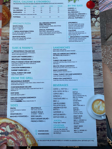 Will never go here again. We asked the waiter for fried calamari and cocktail shrimp as appetizers. He came with our entrées and when asked her said the kitchen had just placed them there. To his disadvantage we were seated right in front of where we can view tge kitchen. It was a lie because I saw the calamari and shrimp placed at the window for over 5 minutes. Never had I seen shrimp cocktail served in a plate full of water and lettuce. I guess thats a first. He never asked if my husband wanted pasta or veggies with his Mahi Mahi and just put pasta without asking. My burger was supposed to have Swiss and mushrooms instead I got American and mushroom not to mention, the burger was half the size of the bun. Very unpleasant experience. Ill stick to Florios for breakfast, lunch and dinner but definitely not Broadwalk. This was my first and last visit here.