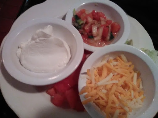 Slow waitress. Ordered nachos, came nothing how I strictly explained. I told her I wanted them with chicken steak bell peppers and onions only! It came with that, plus tomatoes sour cream and olives. I blew that away, picked them off, but then I took my 1st bite, and the cheese was cheddar cheese. Not queso like I asked. I waved the waiter down and told them I wanted a refund and she said it was too late, that I shouldve told her when she brought it out... this place is by far the worst mexican restaurant Ive eaten. Not to mention the food was beyond bad. I dont see how this has 4.5stars....