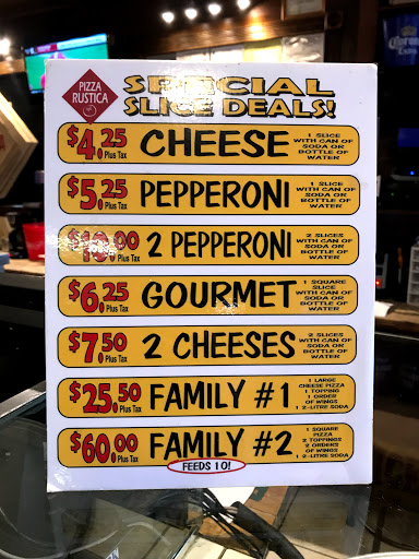 even tho its not ny/nj pizza, the quality of the ingredients are definitely better than mauros down the street w/more variety. never had a problem w/getting sick from pizza rustica & never had a problem w/service.