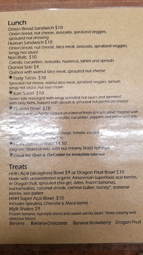 Happy Healthy Human has great food! Im a proud vegan and love their delish kale chips & vegan cheese spread. The down side is the staff is sub-par and the hours listed online are not correct. For example on Friday it says open till 8 and we pulled up at 630 and theyre closed which sucks. Misleading.