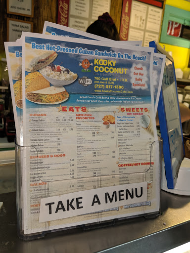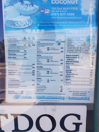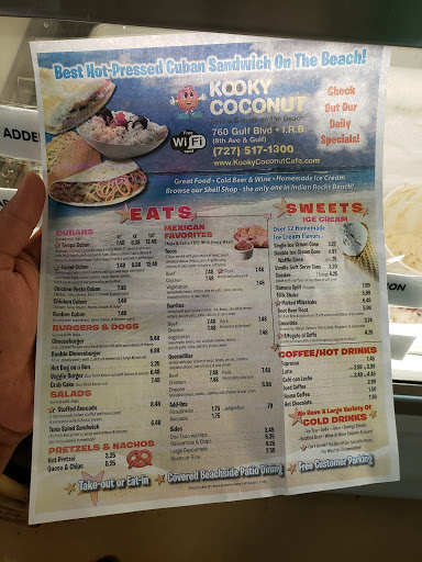 The island vibe, decor, very beachy & fun! You can sit inside in the A.C. to cool off or sit outside the covered back porch at a table with a grass umbrella. The location is literally steps from the sand & beach but parking is limited so you cant leave your car there while you go to the beach BUT public beach access is right behind here and there are some parking spots at that beach access. Weve been here several times over the last 3 months & there has been available parking all but twice. The food at kooky coconut is great, fresh, homemade taste. I love the tuna stuffed avocado! My son loves their hot dogs & awesome ice cream selections. My husband loves their Cuban sandwiches & variety of beer. We have always had good service here. I read a comment below that mentioned a bald guy yelling at people in parking lot and I must say, I have never seen any1 matching that description working there, nor have we ever experienced such a thing there... Coming to think about it, Ive never seen ANY1 yelling at Indian rocks beach, anywhere. Weve been there a lot. Indian rocks beach is a safe, small, beach town, with a very cool, away from the world, laid back, island feel. Its not commercialised, theres many small, locally owned, unique, fun businesses in the area & the kooky coconut is our fav!