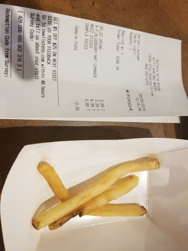 I popped in yesterday to get a to go order on my lunch. I order 6 snack wings And fries. The fries were 3.99 in total I spent about close to 11.00 I didnt check the bag before I left because I was in a rush to get back. I opened the fry container and theres was literally like 10 fries I was so mad I could have got a $5 dollar box from KFC and the wings looked like they just slathered a mess of sauce hurriedly on them and they were so salty. Not even the sauce I asked for. I was so upset about my experience here. Ive never been dissatisfied with a B-Dubs experience until now.