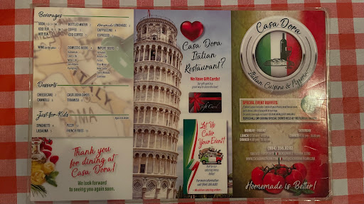 We ate dinner at Casa Dora while in town for a conference last week. It was a very authentic, owner-run Italian restaurant. Everyone really enjoyed their food, from the sandwiches to the full entrees. Prices were very reasonable. The owner was our server (I think) and he was quite on top of things. His personality added some fun to the visit, too. The only thing that kept me from giving it 5 stars was the interior, which could use a little TLC (primarily the bathrooms). But it was clean enough (we had our young kids with us and werent concerned for their safety or anything) that wed most certainly go back. If you like to get away from chains and experience unique local restaurants, you can do a lot worse than Casa Dora.