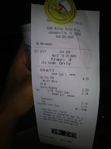The slowest Sonic I have ever been to and they still have trouble getting the ordered items right. If I could give a negative 5 stars I would this has to be the worst managed Sonic around. If I owned the song c franchise I would revoke from this owner.