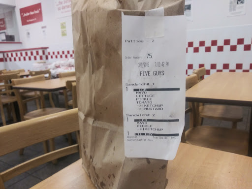 Standard Five Guys - food was cooked consistently considering the last few times Ive gone. Staff was friendly, and the restaurant was nicely kept. Best burgers in town!