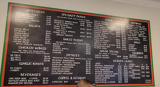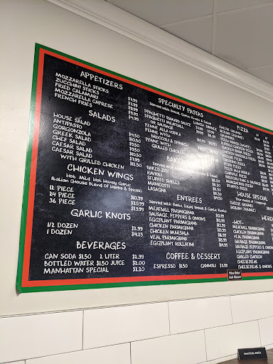 Amazing NY style pizza with authentic crispy crust with chewy center. Reasonably priced and great quality pastas and salads. Amazing waitstaff with great humor and personalities.