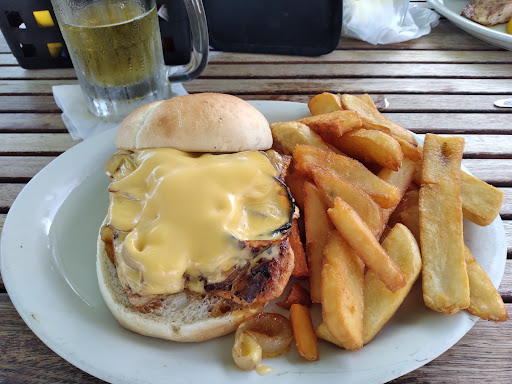 This place is off the beaten track, its slightly scruffy, but worth a visit as you can sit outside on a hot afternoon by the canal. There wasnt much choice for a vegetarian (but I realise it is predominately fish on the menu in these parts, so not a surprise) l chose fries and had the coconut onion rings which werent bad and the portions were large. My companions had chilli, which got the thumbs up and the pulled pork both with fries.The beer came in a giant tankard and went down well. Our waitress was attentive so all good and worth another visit if we are in the area.