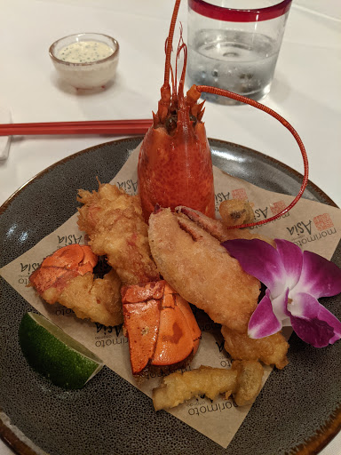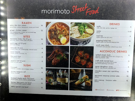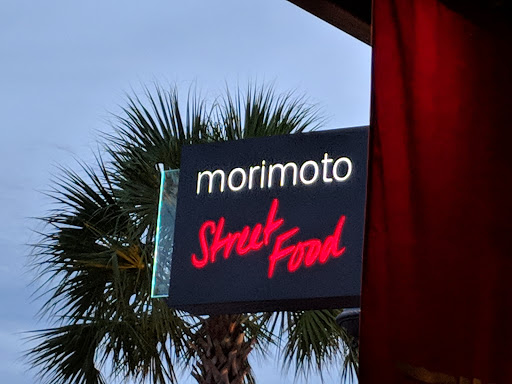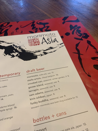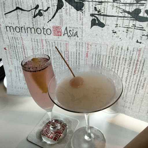 This place is very average and super pricey! My husband and I like to go to different restaurants as a hobby. We enjoy the diversity in Orlando and we try to keep up with the new trendy restaurants opening. We were extremely excited to visit Morimoto Asia, not only because my husband was a chef with the Patina Restaurant Group but also because as a chef he admires Iron Chef Morimoto. From the beginning you can see employees disliking their jobs...you had a bunch of hostesses staring at the people walking in, and instead of being welcoming they looked annoyed and overwhelmed by the crowd. It was a Monday at 9pm so I was hoping the wait wouldnt be too long... unfortunately, they said next available table would be at 9.40pm or first come first serve at the bar. We truly wanted a table but it was pointless to wait so long for a Monday late at night so we chose a high top at the downstairs bar. I will not mention the servers name to avoid getting her in trouble since she wasnt bad... but very unexperienced. She took a long time to get to the table, she repeated the wrong order and she was noticeably nervous. The food is my concern... for being an Iron chefs restaurant... man what a disappointment!!! We had the toro tartare and five spice wings as appetizers, the orange chicken and the chicken pad thai as entrées plus a carafe of their unique Sake Sangria. The Sangria an the wings were the best part, but the toro tartare and the orange chicken were a total mess. We couldnt even finish it (even when being BITE SIZE!!). Portions were waaaay too small for the elevated prices. You can refer to my pictures...we paid over 100 dollars for minimal and very average food... I could have had a better experience for half of the money at The Cheesecake Factory. I do have to give the designer Kudos for the great concept and atmosphere... but thats it! As locals were not returning ever again. We would stay with The CowFish at CityWalk for similar type of cuisine.