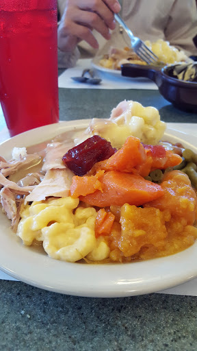 This is part of my review for The Reporter, Century Villages Newspaper. This should appear in the October issue: This very clean and cozy place had a wide variety of salads, fruits, veggies, meats and desserts. You can start at the salads, fresh lettuce, tomatoes, potato or pasta salads, work your way through some veggies, and Ribs or pulled pork, fried chicken or chicken cutlets then you reach the Carving Station, manned by someone that expertly carves Whole Turkey, Ham, Corned Beef, and Prime Rib and If you like Leg of Lamb, You will be surprised to find it here at lunch or dinner EVERY DAY! After the meats, there is another veggie station that includes corn on the cob, mashed potatoes, sweet potatoes, green beans, a few gravies and more. For an additional $3.00 you can get various multi-layered cakes, pies, cheesecake and cobblers at the dessert bar. Better deal than Golden Coral, and the food tastes great. Five stars just isnt enough.