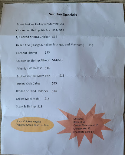 Very good food. Homemade vegetable soup that they had today was excellent. Athenian Grouper was very good! A lot of food for the money and friendly service.