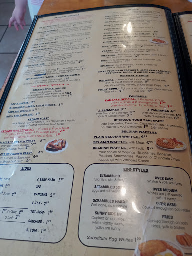 Waiter was short,rude, and didnt have a friendly greeting. The food was basic if that the pancake and French toast breakfast ..the meat is not fresh, hashbrowns big pile of mush, pancakes under cooked and too rich, French toast tasted like frozen French toast. Our waiter decided to sit down and have a Belgium waffle with strawberries and a mountain of whip cream while we were waitin on our check which took 20 minutes. Usually I take my leftovers but I politely left that mess there.