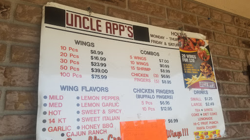 This place has excellent food, such as. Wings& fries with a wide variety of sauces to choose from, shrimp, chicken tenders and a large scale of drinks, as well as alcoholic beverages of many authentic names and levels. Formerly known as Wingspot of lakeland fl. As a person who has been a loyal customer, i must say Ive been and still am satisfied with Uncle Apps!