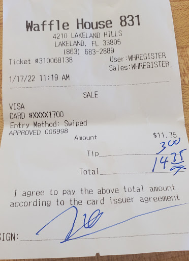 My wife and I really enjoyed our meal at this waffle house. The eggs were cooked perfectly and the service was awesome. If there is anyone that deserves $15.00 an hour it would be the server and the cook. Heck just give them $20. 00 an hour. I know we gave the cook a $5.00 tip and the waitress a 8.00 tip on a $12.00 ticket. I would eat there again but were from Charleston S.C. and are on our way back home.