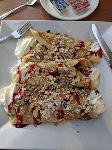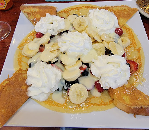 Amazing breakfast! They make omelets with FIVE eggs. It was almost the size of my forearm! I had their crepe and French toast that was topped with English cream. I added strawberries, blueberries, and whipped cream. It was just so good! Barely needed any syrup. Service was excellent and fair pricing for the size dish you get.