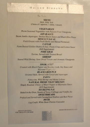 There are few restaurants I would take the time to write a review. Maison Blanche merits one due to the superb service, relaxed take your time with each course and dishes with flavors that send your taste buds to heaven. My wife started with the the asparagus soup. The soap bowl came with asparagus tips in the center and the waiter poured in steaming hot soup. I had the Mesclun salad with herbs, pine nuts and slices of parmesan cheese. I am quite picky about dressing, and often salads are served with too much or too little dressing. It was just right. We had red snapper with garlic potatoes and Sea Bass with spinach roasted meunière, and a delightful sauce. We ordered the least expensive bottle of white wine, we received the same level of attentive service that the two tables around us that ordered wines at the top of the list. We will return for future meals.
