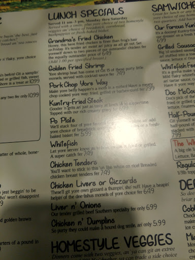 Good southern style, home cooking. The waitresses are golden! As often as I eat there with my coworkers, I dont ever recall a bad experience with food, service, or anything for that matter! Huge menu with lots of options.