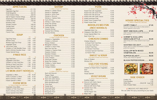 The atmosphere is quiet, air conditioned, and clean. The food is average, about what youd expect from a family run Chinese place, but compared to the other Asian places in the area, its a cut above. Staff is always courteous and friendly. Theyve added an online ordering system for convenience that works great. 5 stars because of the friendly staff and clean environment.