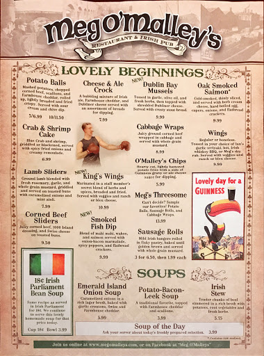 When you enter Meg OMalleys you start to get the sense of being in an Irish pub. Dark wood and lots of ale paraphernalia. The hostess seemed a bit overwhelmed when she sat us, she might have been new. I couldnt decide what I wanted to eat - the menu is impressive with all the Irish staples. I decided on the Kilkenney, probably one of the best sandwiches I have had in a long, long time. I added a side of Tater Tots which were perfect. From the salads to the kids meals, everyone left the restaurant full and happy. One complaint - the booth they sat us at had a 2 top right next to it where one person at the 2 top would have their back right next to your side. It was weird. Definitely will go back again and again.