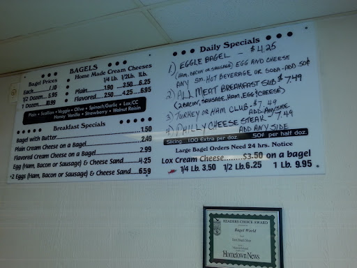 I love Bagel World! Top quality ingredients! Everything is sooooo fresh and lots of healthy choices for breakfast and lunch. I love their homemade garden vegetable cream cheese sooooo much! Its so delicious and a healthy choice. Also this is the only place I can find an authentic Antipasto Salad and eat it in peace. No televisions blaring and loud music. You can even sit and read while enjoying art rotated biweekly by local artists. This is a great place to go eat when you want to hear what your date is saying. This is a great place to eat if you want food prepared with time, love and care.