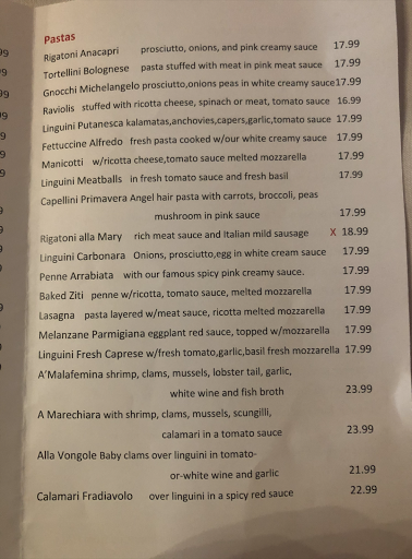5 Stars Food,The Lobster Ravioli and the Pink Sauce,OMG!.Delicioussssss.I did take out.Will Dine in Next Time,Its a place that by the outside appearance doesnt look like a great eating venue.Small in seating,however the Lobster Ravioli,along with the small breads you dip in the heavenly pink sauce is worth the price,and a second comeback.Price Ravioli was $22.+tip,but Great Food is Priceless in my opinion..