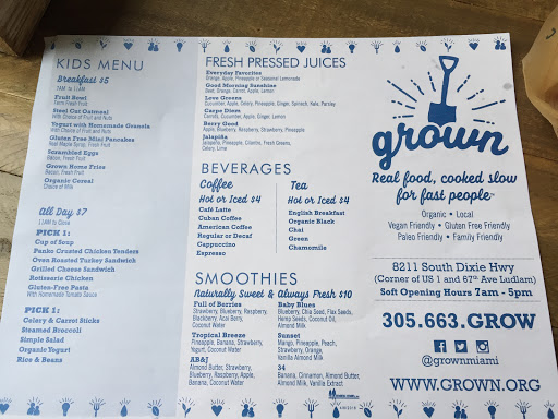 Grown is a great concept: healthy, organic food cooked for either someone on the go or for a nice sit-down meal. At a glance the menu is great and has a wide array of healthy options. The cons: Too expensive, not cooked fast enough, and the flavors fall short of the price youre paying. The hours for breakfast are also not convenient as they open too late to get something before work.