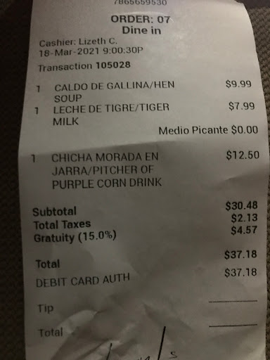 The waitress had really bad customer service. When asked for water, she did not even bring us tap water. She brought us bottled water without asking. The shakes had no flavor. And the "medium" spice ceviche was more hot than anything. Couldnt even eat it. Then when asked if she could take it back, and exchange it, she said no that they werent allowed to. It was definitely not worth the money. She would even walk away when we were speaking to her. And it wasnt even a busy day. Never will I go there again.