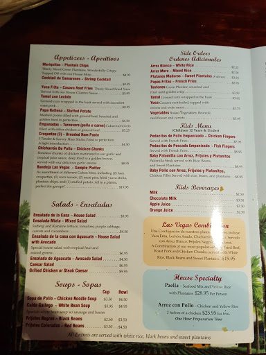 Good service. All people were nice. The Cuban fried pork chunks (masas de cerdo fritas) were undercooked and look like pre-frozen. The tostones and french fries were outstanding.