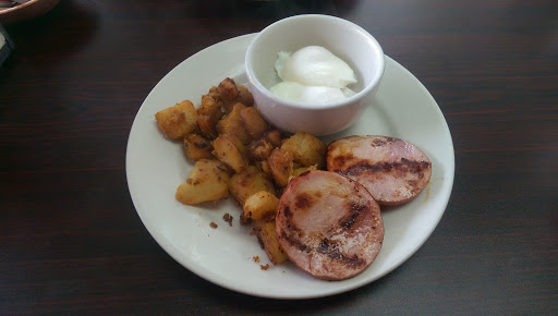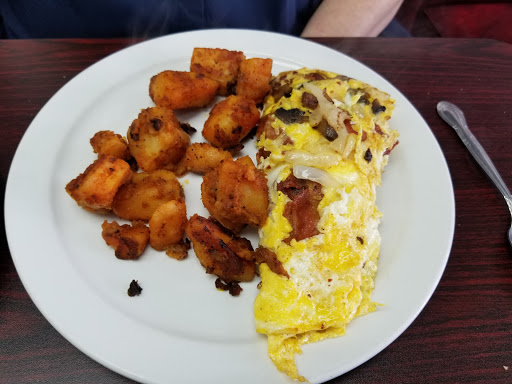 Dont Eat Here. The waitresses were nice, but I definitely didnt trust the cleanliness of it. Something told me to walk out when I noticed that the waitress bringing out the food had on a tank top with flubbery arms. You just knew that some sweat from her underarm has probably gotten into someones food. Anyone working with food, should have sleeves. The place is small and cramped and the food was not good...at all. The steak that we ordered was so rubbery we couldnt eat it. Waffle was bland. The potatoes tasted yucky and that had to be the worst bacon I ever tasted in my life.