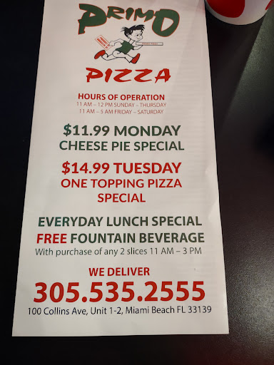 This place is garbage! Ive lived on Miami Beach for 6 years and this place used to be good... But the last two times Ive ordered pizza from here theyve completely messed up my order. The first time with the meatball pie, they didnt put any mozzarella. So I went back with the whole pie and asked for the mozzarella and the guy trys to tell me that it doesnt come with mozzarella, until I explain that Im not a tourist and I eat here all the time then he finally concedes that theyre out of mozzarella. Why they didnt say that when I ordered the pie in the first place is beyond me, why they tried to lie about the situation afterwards is ridiculous. That was about 4 months ago, after giving Primos some cool off time I ordered another pizza tonight, at 11pm an hour before they close. I called back at ten past midnight and he says the driver is on his way, finally. The pizza was supposed to be half margherita and half pepperoni, it wasnt... It was half margherita and half basic cheese pizza! When I called back they offered me a $1.29 refund... No seriously, the difference between an enjoyable pizza and a pile of chuck-e-cheese in this mans head can actually equate to a mere $1.29?!? When you want pepperoni and you get cheese pizza $1.29 isnt going to make bland taste any better. So, of course seeing that I am not satisfied the gentleman decides that he will lieto me instead. He tells me that he will bring me the proper pepperoni portion as soon as he can but it may take his driver some time. Of course theyre supposed to close at midnight, so guess who; the joke is on the guy looking at a cold cheese pizza waiting on a fresh pepperoni pizza that will never come because the pizza man went to sleep with my $1.29 in his pocket. Now I know what you may be thinking, why dont I look at the pizza first? Well let me just say this first and foremost it is because I operate on the trust that a local business owner would not knowingly screw people over and simultaneously ruin their home dining experience and that I would have the pizza which I ordered, but clearly that trust is terribly misplaced with Primos Pizza in Miami Beach. And second is because I am too hungry, they are technically taking advantage of me in these moments. Sorry guys, but I would NEVER eat here again and I will tell everybody not to go there anymore because of how bad your service is now. The city could wash this place out with the sewage as far as I am concerned.