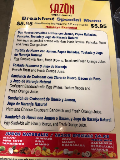 Outstanding Cuban Restaurant in North Beach. We were have a beach day away from Fort Lauderdale and ended up nearby. We have been looking for good Cuban food and we found it in Sazon. Whenever I go to a new restaurant, I always look for the icon to indicate the favorites. In this case the menu had a maraca next to local favorites. I decided upon Sazon Pollo Enrollado Relleno (rolled chicken stuffed with mashed sweet plantains with a sweet chimichurri sauce) with a side of rice and beans and a Coke. The dish was out of this world. Sweet and tangy and savory all in one bite. It was definitely an item to be recommended. The rice and beans were consistent and I added them to the leftover chimichurri sauce for an added kick. The waitstaff was impeccable and I highly recommend this place. The only negative is they dont have a fountain soda machine they serve cans. Im a big drinker (not alcohol, just drinker), so I appreciate when a restaurant has a fountain machine that they can give us refills. My nitpicky adjustment of this fabulous restaurant.