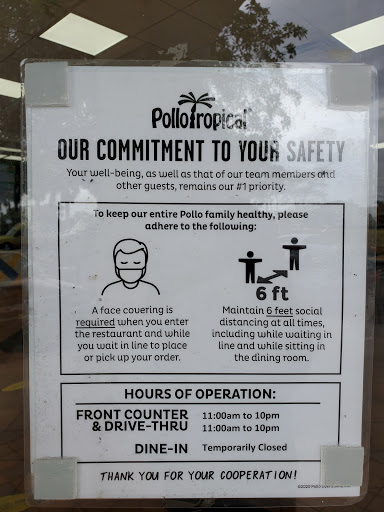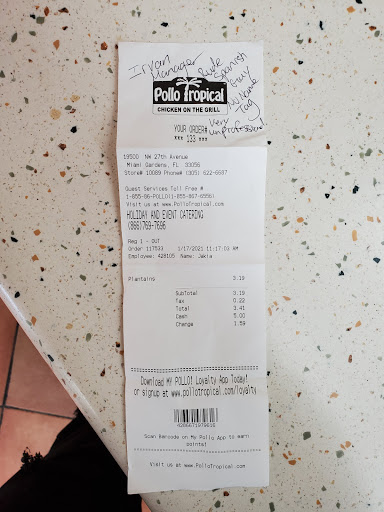 Never an issue with the food here. A bit busy at times but thats all Pollo Tropical Restaurants.