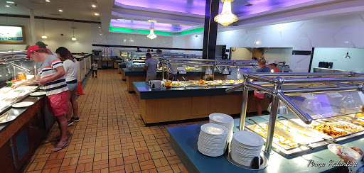 Surf and Turf buffet with Asian (Chinese and sushi) focus but some American food as well. Sushi is decent. Domestic foods include all the usual suspects. Staff are all Chinese immigrants on work Visas and very friendly. Sodas and especially beer are extra. Meats are prepared fresh and refreshed often. There is a salad bar for the vegetarian in your group. Seasonally snow crab of offered as a buffet item. Expect a longer wait and larger bill when trying to get a seat during season as in the evenings the snow crab is brought out. I personally like the chicken skewers, chicken nuggets, fries and onion rings. Kids (or kids at heart) get unlimited ice cream.