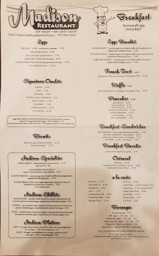 OK if your looking for down home cooking its right here! I love going to Madison. I love that the owner Tom and his wife come up to you and get to know you.And you get real bacon and real sausage. They have specials for breakfast that include your coffee for far cheaper then Ihop or Dennys and the food is way better. I like going to a resturant that is clean and you get alot for your money here! The staff are all really nice and I try to get there once a week for breakfast...wish I could go more! Trish