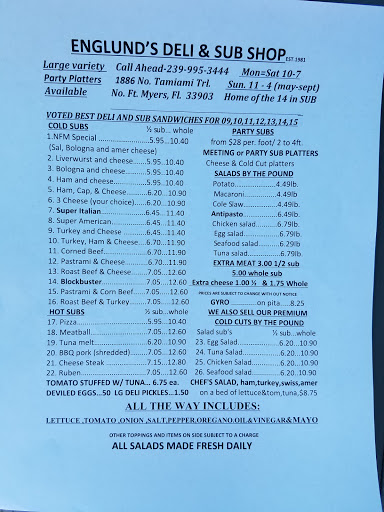 I have been an Englunds regular since I was a small child. Lets just say, my recent experience was less than enjoyable. I knew that they had closed for a short period of time; however, I was not aware that they would return with the same name but as an entirely different entity. I choose to order my all time favorite.... Roast beef and provolone, all the way, with added pickles and cherry peppers. Boy was I disappointed! The meat was less than average quality and sliced and stacked terribly. I had little to no toppings. And my favorite part, the pickles, were an utter disappointment. I say this because, the real Englunds slices their own Kosher pickles just for their subs. I could continue but it seems to be a waste. If you want a true Englunds sub, go to the Cape Coral location. The new owners of Englunds - North Fort Myers - do not deserve to carry the name.