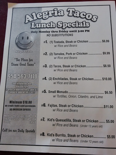 I moved to Fort Lauderdale from Southern California ten months ago and had been craving Mexican food all this time. When the overwhelming desire to eat Menudo consumed me yesterday, I did an internet search and found Alegria Tacos. // This restaurant embodies everything Ive grown-up to expect from a good Mexican restaurant: its small and a dive, but the service and food is out-of-this-world. I was greeted by Edie and she was warm, polite, and genuinely kind. My excitement had me order a Carne Asada Burrito combo, large Menudo, Chicken Enchilada combo, 2 tacos de Carne Asada, and 2 tacos de Lengua - all to go. The total cost was very reasonable - I couldnt believe it. // When I was home, the containers were filled with food and the flavors were *authentic*. This isnt crappy canned food, this is THE REAL DEAL. The beans are light; the rice is separate and fluffy; the textures of the tacos; the meats flavor; and - oh, man!! I divided the food with a friend and he, too, was taken aback. Needless to say I ate my entire half and gained 5 pounds... but I really dont care. Id gladly do it again in a heartbeat. // This is a new, favorite place to eat and they have 2 brand new customers for life. // If you want genuine, authentic Mexican food, then stop by Alegria Tacos. You will not be disappointed - and your wallet wont be hurt either.