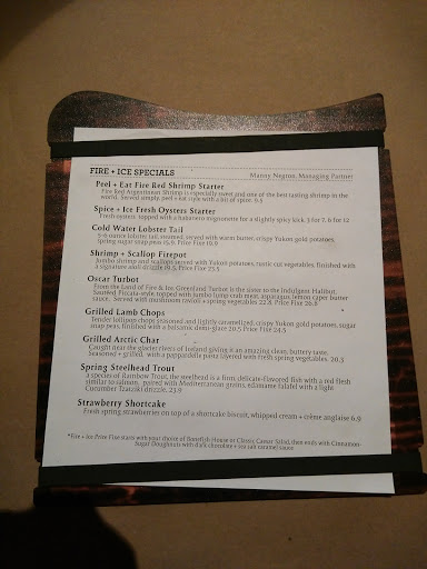 Did not think there were an abundance of menu options, more like main dishes prepared different ways. The salmon was great. Services were great. Prices didnt reflect well comparatively to the dish, in my opinion. Would revisit to try something else.