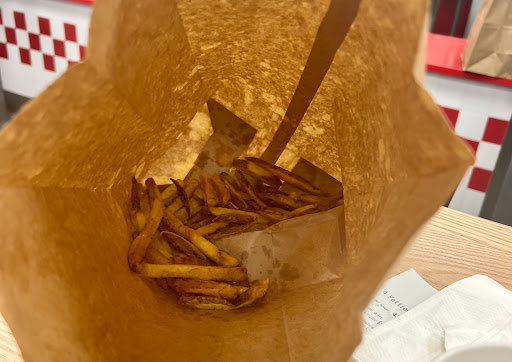 Fast friendly service and food is always cooked correctly to order. Five guys has the best burgers in town and its not even close.