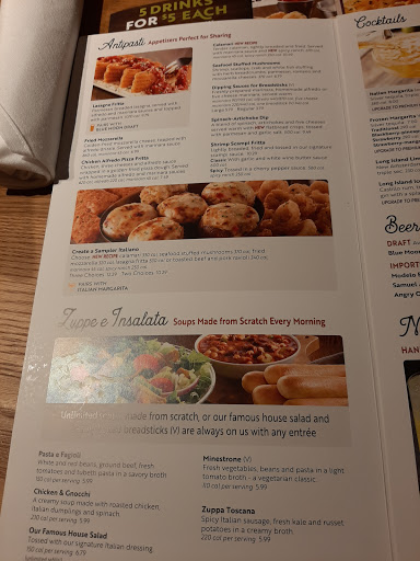 To go on line placed my order for pick up at 5:10pm first no place for you to park for pickup orders,Oh yeah they have a stop put it is taken up by people eating there,when I said that the parking spot that is Clearly marked for pick up is taken up by people eating in and theres no where to park,So sorry nothing we can do ,,if that was not bad enough when I got home with my Zuppa Toscana was nothing more than broth no nothing one or two potatoes little green bits of sausage ,,it Sucked I will never do take out again when you dine in you get the Meat sausage and the kale,not the Shaft The worst thing on a Friday is feel you were Ripped off