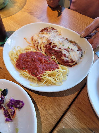 When you walk into this restaurant, the odor of italian food and bleach hits my nose. The wait staff is good and the food is just as tasty as found at other Olive Garden locations. Its a good, familiar experience consistent with the Olive Garden formula but not memorable. The dining area is nice but during my last few visits, the booth table seemed crowded with three of us dining. Much of the food is good but not exciting. The salad is mainly a bowl of lettuce and the breadsticks are hot, doughy and boring. A few tweaks to the food to bring it to life, a more exciting salad and hot bread dipped in garlic and olive oil could give this Italian some pizazz!