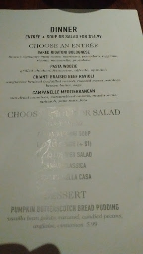 August 2012 Went back again with my Brother-in-law and Farther-in-law for whom this restaurant is a favorite stop after doctors visits. I had the tilapia lunch special which is served over an orzo tossed with spinach and mushrooms. I had no idea tilapia could be so well done. The food, service and ambience was so good I told my husband about the lunch date three times over the next week. Ill be back. -------------------------------------------------------------------- Original Review 2010 Came on strong recommendation from the family plus a gift card. The service was very good. I was in particular impressed to see managers out on the floor actually serving and no servers standing around gossiping. I ordered the wedding soup and the steak flatbread. Enjoyed the flatbread but the wedding soup was very greasy, meatballs were fragments, broth was muddy overall bad wedding soup. The bread seemed likely to have been frozen and was okay. My husband had the meatball sliders and reported the meatballs to be soggy and bland. He didnt finish. Tried some of my sister-in-laws lobster bisque. It was overly thick, almost melted velveeta consistency and quite salty. So I guess Im not a food fan of the place but would go back to keep the family company.