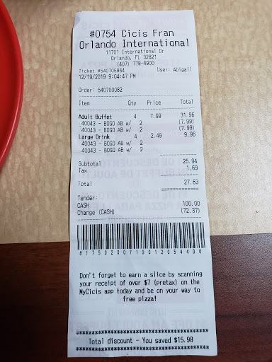 Horrible!Nothing like the CiCis at home and we too,live in a tourist City! This store has lot of tourist customers and is crowded. The pizza is cracker thin and barely has any toppings! Theworkersarenot friendly welcoming and they do not bus your table,as any other CiCis Ive ever been to does! My kids hated it and so did husband and I! We had a by one get one free buffet coupon and still were charged nearly $40,fo sub-accounts,crackerlike pizza with very little toppings. The ranch dressing was awful and I couldnt eat my salad. Everything here was just awful, except for the cold drinks! Avoid it like the plague! I love the CiCis in my home town ,but this one is totally a bad example of a CiCis restaurant! Also, there was aJamaican panhandlet out front,begging money.