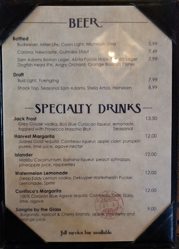 When I got to Confisco they made me wait 15 minutes for a dirty table. They gave me a used plates with butter and bread crumbs. I told a waiter and they took care of it. It was a long wait for the food but it was long wait. The mens bathroom did not have paper towels. I told a waiter and when I went in there there were still no paper towels. They didnt have drying fans.