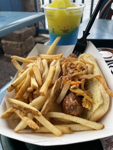 Food was tasty and reasonably priced. Had the pork sandwich and fries with cheese and pork. Wed eat there again. Seating can be difficult to find, but keep going towards the water, theres bound to be seats available.