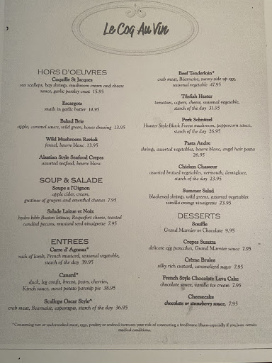 Wow, this is a fantastic restaurant with delicious food and excellent service. Le Coq Au Vin uses the very finest and freshest ingredients and it definitely comes through in the outstanding flavor of the finished product. It is not cheap or low-priced, but the food is some of the best Ive ever tasted, and is well worth the price. This is our new favorite restaurant! I visited recently with my wife and her parents. It was her mothers birthday and this was her mothers selection (although we were slightly hesitant due to a few disappointing experiences with French cuisine in the past). We began with each selecting an hor doeuvre. I started with a hearty crock of robust French onion soup. We also had the baked brie, escargot, and fried green tomatoes. All were excellent and portions were generous. For main course, I chose the Beef tenderloin sautéed with crab meat and béarnaise sauce. This was superb! My wife ordered the beef Tournedos and was seriously impressed by the outstanding flavor and quality of every aspect of the skilled culinary preparation. Her parents ordered the Hunter style schnitzel, and chefs special boar; and they delighted in the enjoyable deliciousness. I had their crème brulée for dessert, which was the best Ive ever had (and crème brulée is typically my favorite dessert, so Ive had many). The only disappoint of the evening was the coffee. While it wasnt "bad," it was just ordinary and not a rich, powerful dark French roast that I hoped for. As is the old adege, "you get what you pay for" it is true. The finest ingredients and most skilled preparation doesnt come cheap, but thankfully, that is not Le Coq Au Vins goal. I felt that the prices were reasonable and not over-priced; just reflective of the price of the very best quality of food and preparation. Excellent!