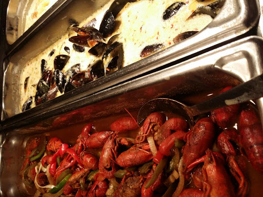 Im surprised this place is still open! The only reason why my husband and I sat down and ate at this restaurant was because we purchased a Groupon. Not only is the selection poor and the food is not seasoned they have a dude with a nasty attitude rationing the lobster and crab legs. The lobster was rubbery and 1 of the crab legs was BAD! I dont mean bad as in being cold or not seasoned but BAD as in SPOILED!!! I could NOT get the funk off of my hands. All the sanitizer in my purse could not get rid of the funk. When we brought it to the attention of the waiter he apologized immediately and removed the foul smelling crab legs from the table offering to replace them with fresh crab legs. At this point we just wanted the lobster and crab legs removed from the bill and wanted to speak with the manager. We waited 15 minutes only for the other waiter to return and say that the manager stepped out and he was second in command. We stated the issue and he wanted to argue. We didnt allow that to happen. He left our table and later returned removing the lobster and crab legs from the bill. I would have given them a zero if I had the option. The only thing good about this place was the very nice waiter in which we made sure that we tipped.