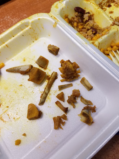 I got the Curry Goat and it by itself was pretty good, my issue comes from the sheer volume of bones in various sizes in my goat. On my first bite I had a thin piece of bone push up into my gums. Perhaps they lower their preparation time but cutting the bones and meat and putting it all together. I dont mind bones but leave them large enough to be safe.